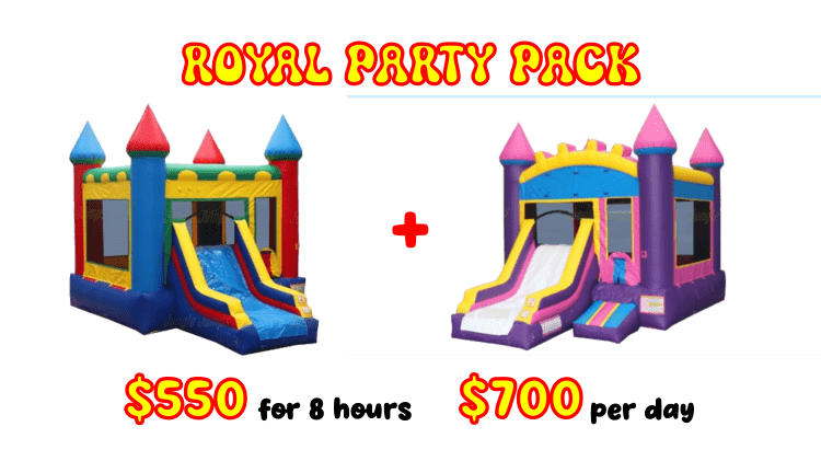 The Royal Party Pack is a fun, royal-themed rental package that brings two colorful inflatable attractions together for a bigger celebration setup. With bright castle-style styling, bold colors, and a festive look, it adds an exciting centerpiece to birthdays, school events, and neighborhood parties. It offers a playful space for kids to bounce and enjoy active fun, while also giving your event a polished, eye-catching theme. This package is a great choice when you want more than just one inflatable and want to create a lively party atmosphere with a coordinated look.